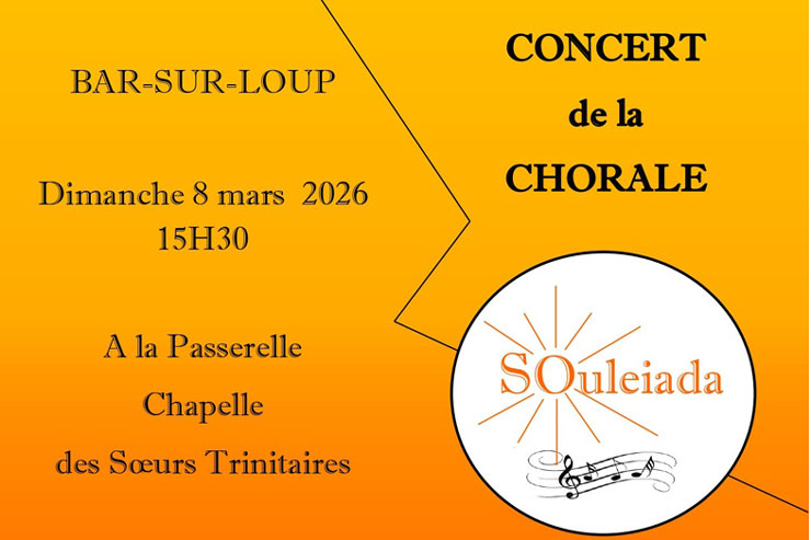 Les Rendez-vous de Loup vous propose : Dimanche 8 mars à 15h30 dans la chapelle de La Passerelle, venez écouter SOULEIADA, groupe vocal et instrumental de Provence, du Pays niçois, et d’Italie, qui interprète des chants polyphoniques traditionnels.
