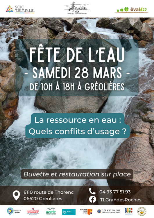 Le28marsde10h00 à 18h00LieuTiers-Lieu les Grandes RochesGréolièresCULTURE, ENVIRONNEMENTFête de l'eauAjouter à mon calendrierLa ressource en eau : Quels conflits d'usage ?Buvette et restauration sur placeTél : 04 93 77 51 93Sélection de la vue© OpenStreetMap contributorsFermerPrécédentRetour à la listeSuivant