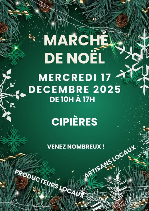 Le17déc.de10h00 à 17h00LieuPlace de CipièresCipièresMARCHÉMarché de Noël de CipièresAjouter à mon calendrierArtisans locauxProducteurs locauxSélection de la vue© OpenStreetMap contributorsFermerPrécédentRetour à la listeSuivant