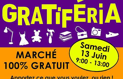 Le13juinMARCHÉGratifériaUne Gratiféria, c’est comme un vide-grenier, mais entièrement gratuit : apportez ce que vous voulez,…de09h00 à 13h00LieuJardin TajasquePlace Tajasque06140Tourrettes-sur-loup