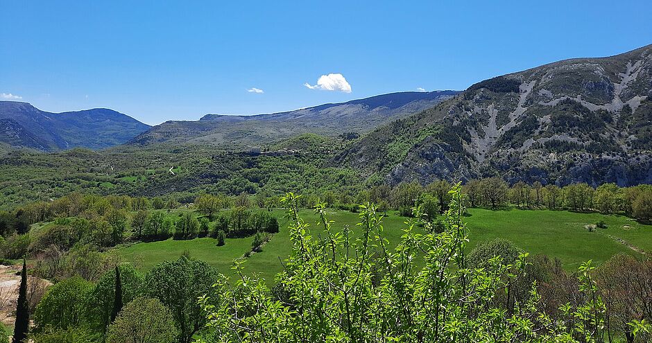 Sentier cheminant au travers du monde minéral de la montagne du Cheiron pour rejoindre le hameau de St Pons. Le regard se porte sur la vallée du Loup, les deux villages médiévaux de Cipières et Gréolières, et au loin sur la mer.